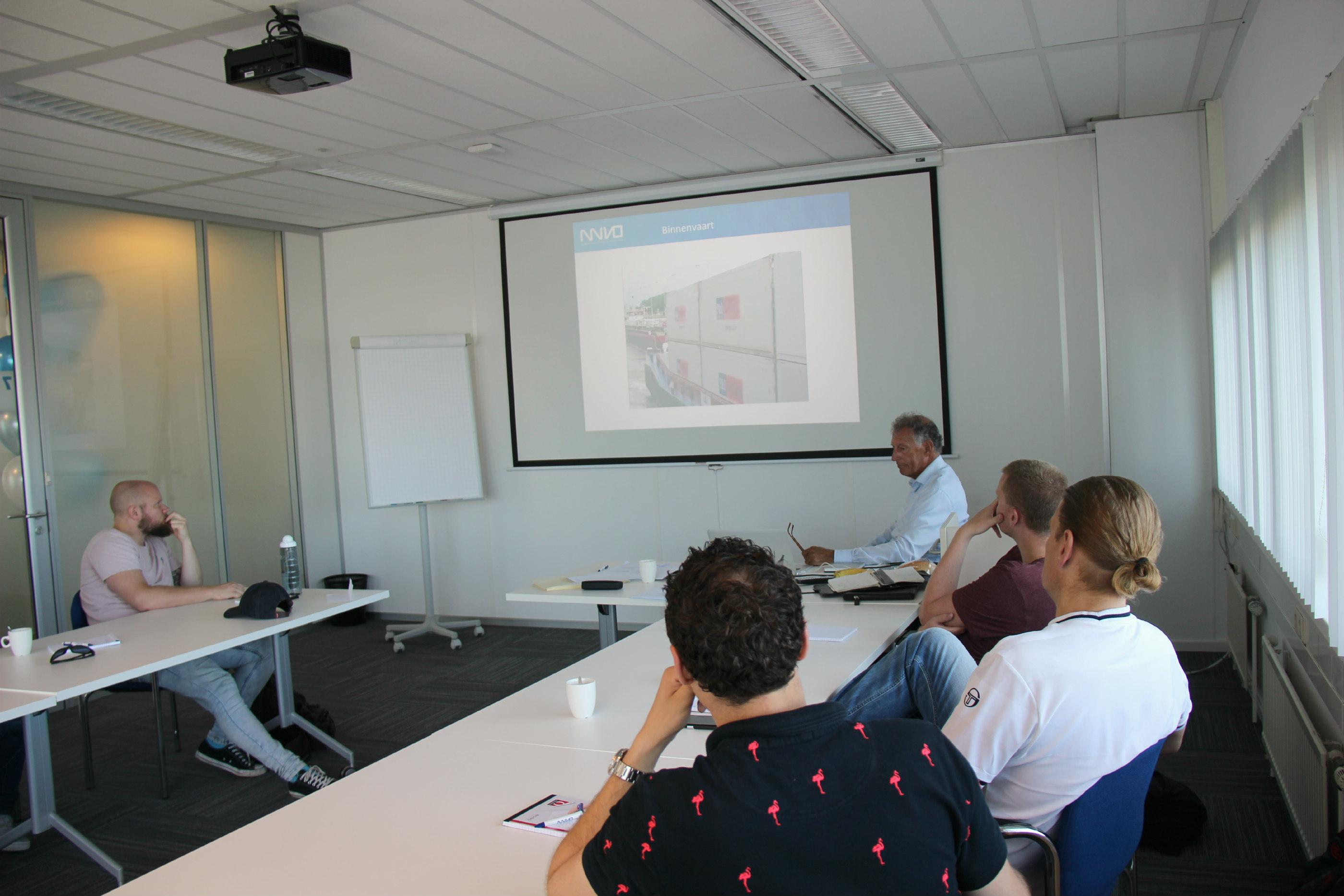 De eerste lesdag in het kantoorpand van NNVO stond in het teken van de introductiecursus voor het nautisch werkveld. Onderwerpen zoals veiligheid, techniek, reddingsacties en wetten en reglementen passeerden de revue. Tussen de bedrijven door legde Farida Hamidullahkhan, coördinator van de Nautische Leerlijnen, uit hoe de nieuwe NNVO-app in zijn werk gaat. Zowel de docent als de cursisten waren enthousiast over de leslocatie.